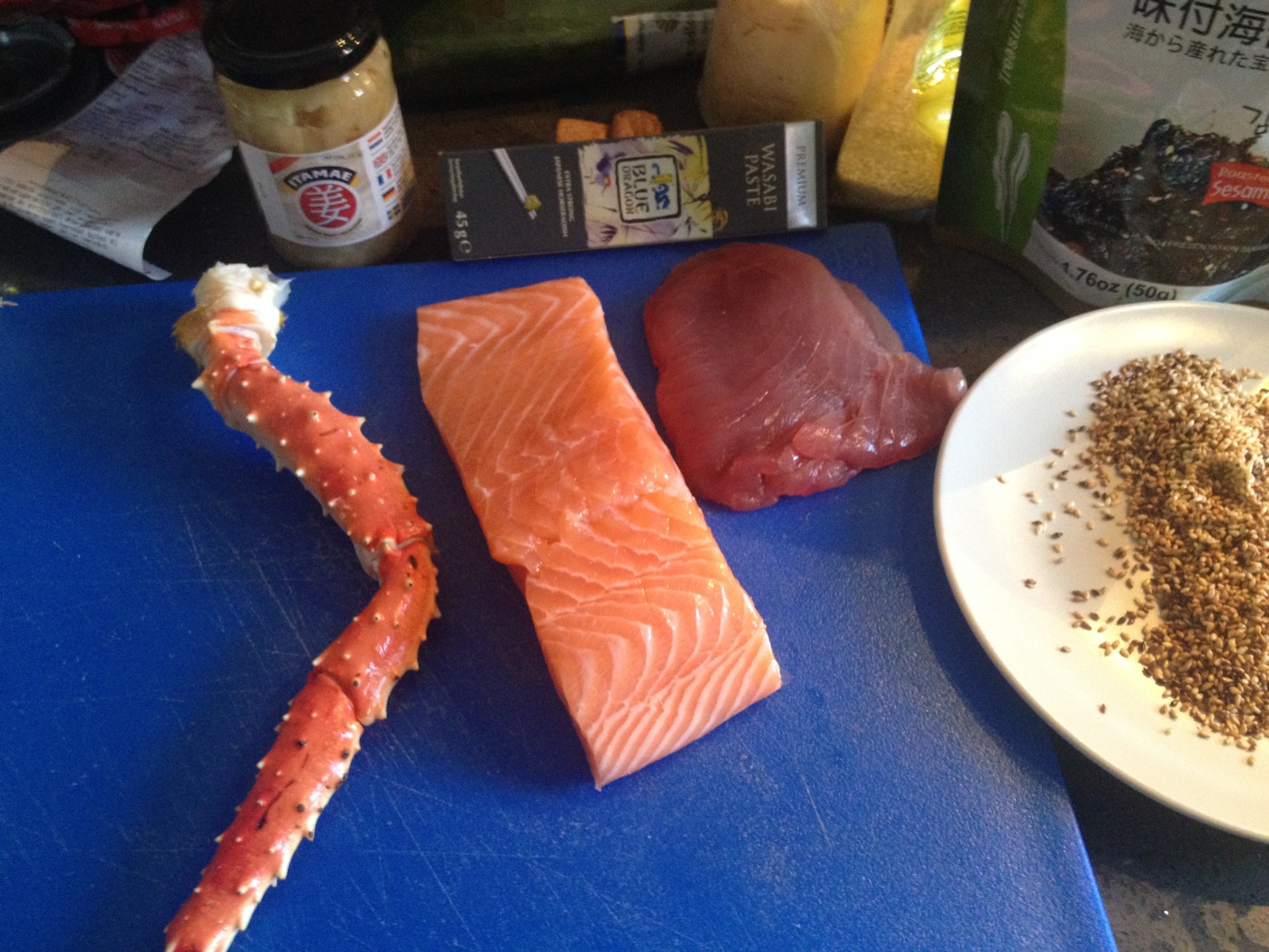 Skär till fina bitar av laxen. Köper du salmi är det bara att skära rätt över filén med vass kniv. Gör lika dant med tonfisken.