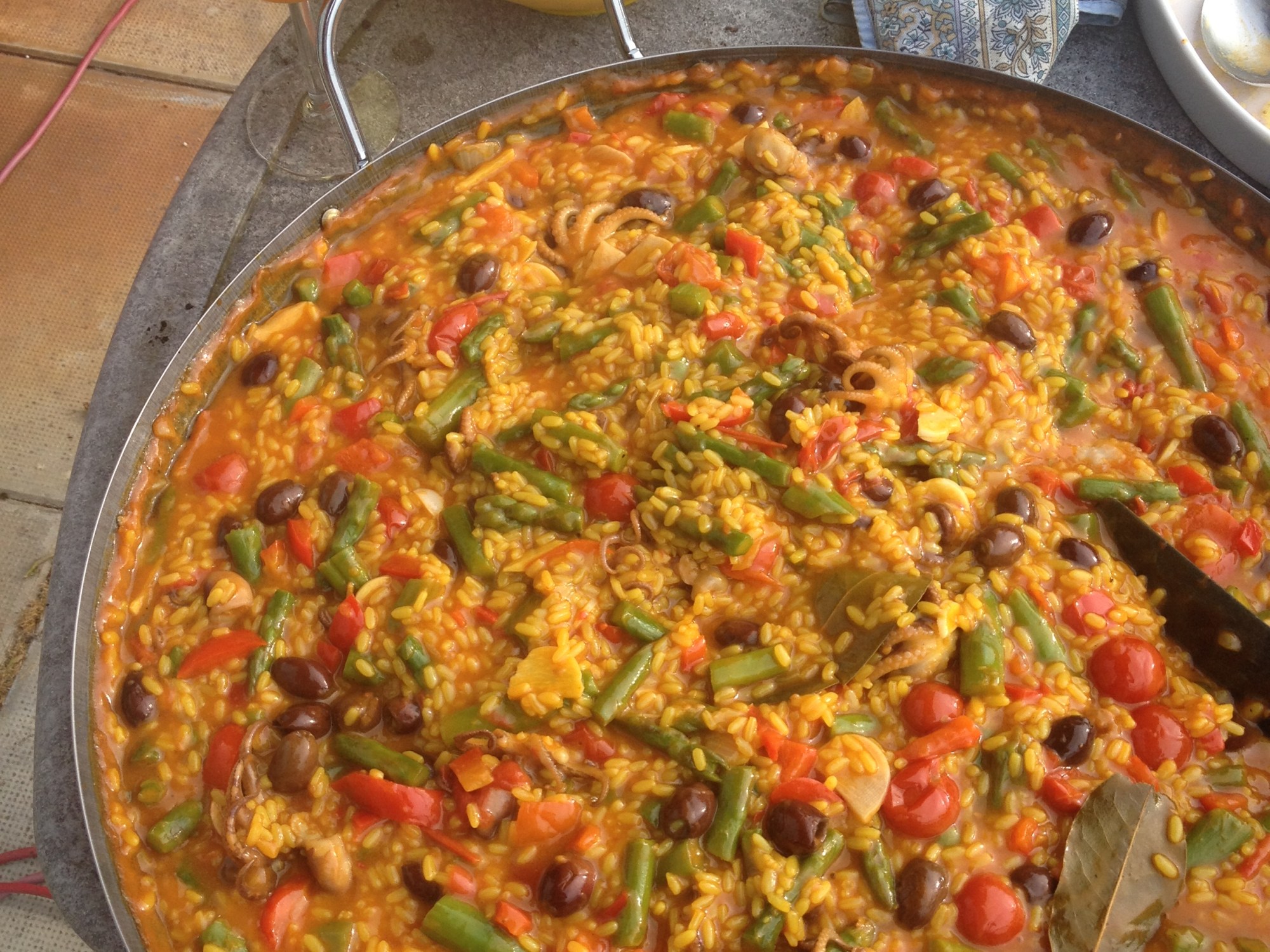 Paella är en fantastisk bjudrätt, gärna utomhus på sommaren. Jag har själv en stor paellapanna och en stor gasbrännare så det är dessutom ganska enkelt att göra. Det finns en massa olika recept och mitt kan varieras i oändlighet. Viktigt är ett bra ris, och bra kombo på kött och skaldjur.