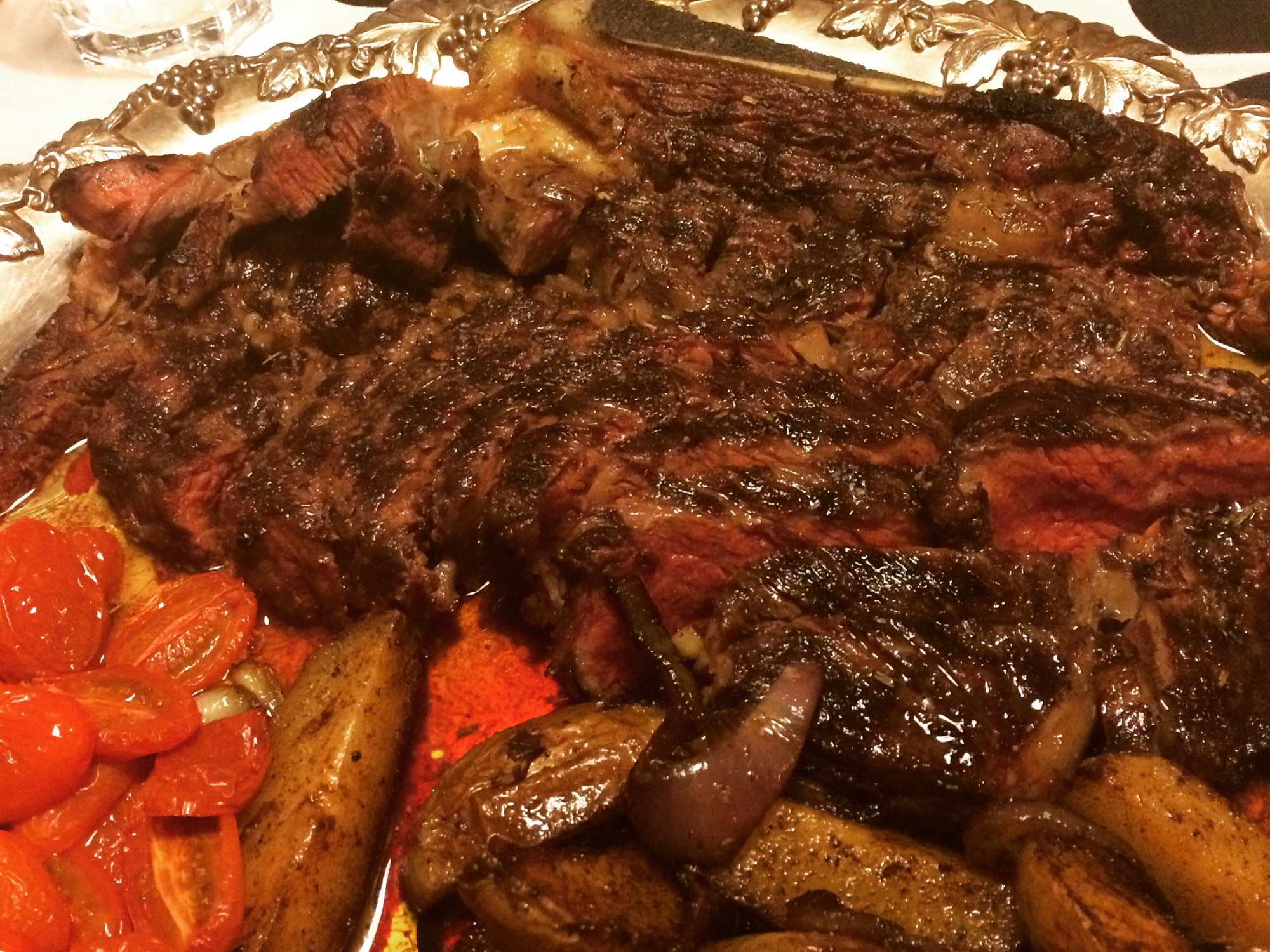 När köttet är klart, skiva upp det, lägg på ett stort fat, med potatis och semitorkade tomater. Slå det smälta smöret över köttet.