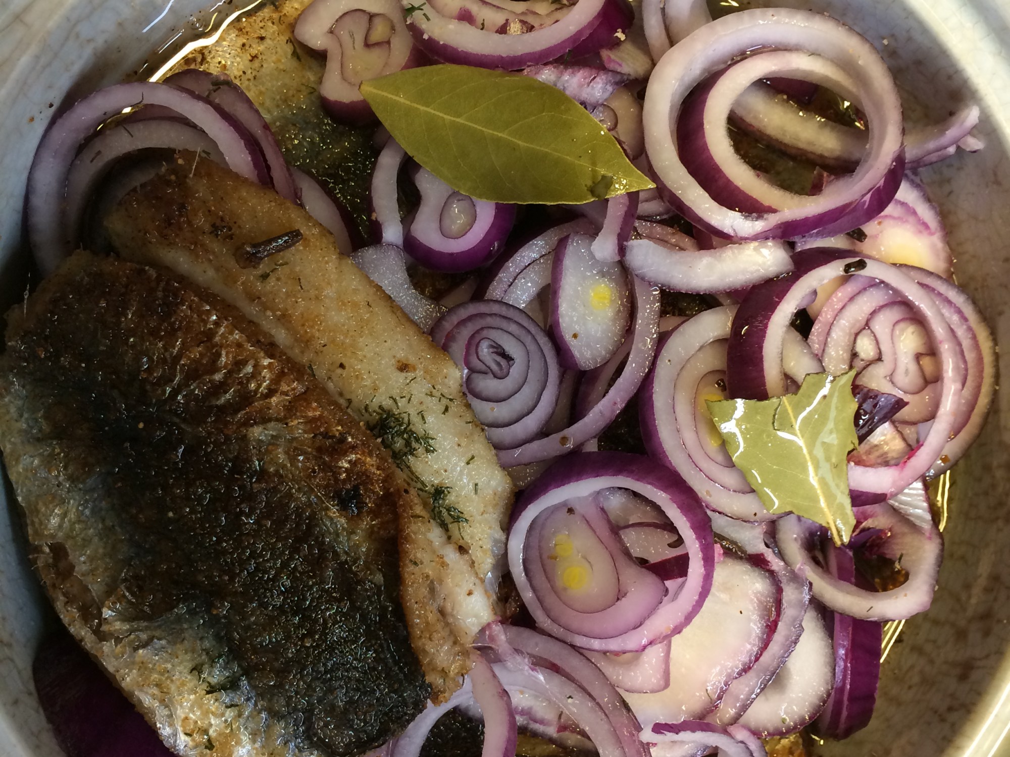 När lagen svalnat, slå den över strömmingsflundrorna. Täck med massor av skivad lök.