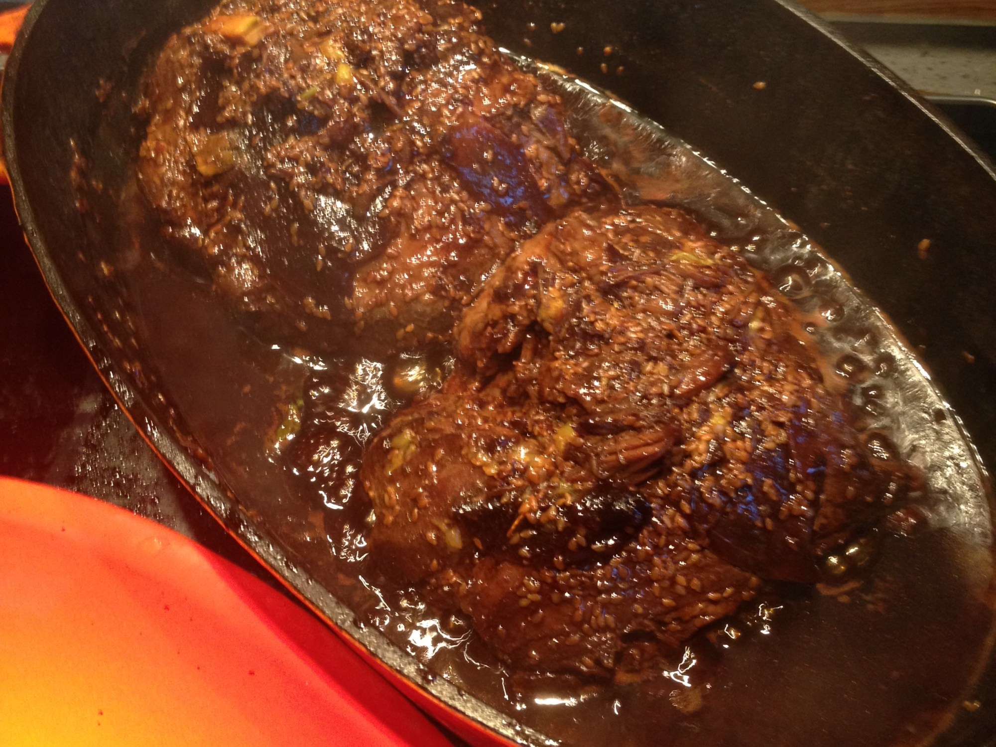 Marinera kinderna i vinet, de finhackade grönsakerna (Mire Poix), timjan, vitpeppar och lagerblad. Marinera gärna så länge som tre dagar i lufttät plastpåse i kylen. Sila av spadet och stek kinderna och grönsakerna i gryta. Häll över spadet och låt sjuda i tre-fyra timmar. Ta upp kinderna ur grytan och låt dem svalna. De ska vara riktigt möra vid detta laget, så var lite försiktig när du tar ur dem. Sila av spadet och koka ihop med kalvfond, ytterligare lite rödvin. Koka ner till ungefär hälften, smaksätt med rosmarin, timjan, farinsocker och salt och peppar. Red av med lite arrowrot om så behövs. Låt såsen koka ca fem minuter med kryddorna.